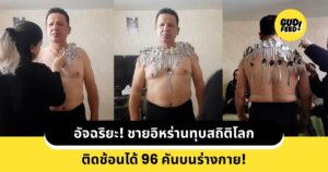 อัจฉริยะ! ชายอิหร่านทุบสถิติโลก ติดช้อนได้ 96 คันบนร่างกาย