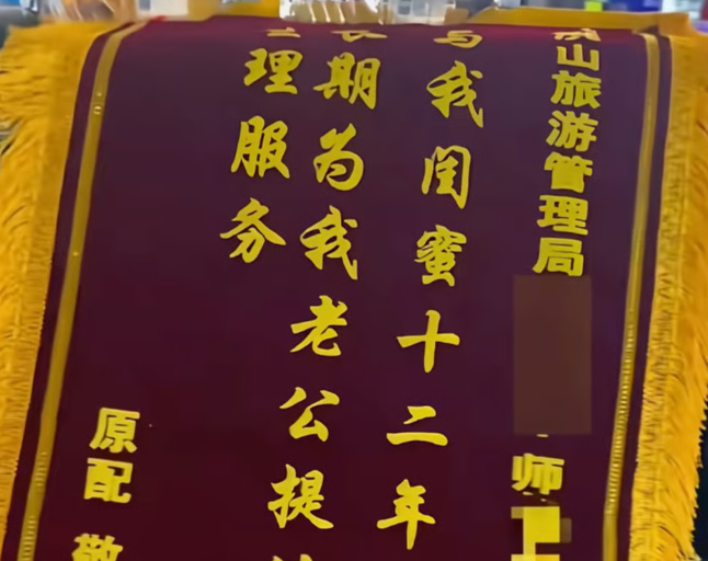 ป้ายผ้าสีแดงดังกล่าวทำเลียนแบบป้ายที่ใช้ในการขอบคุณแบบดั้งเดิมของชาวจีน โดยมีข้อความที่เจ็บแสบและพาดพิงถึงหญิงแซ่ซือ ซึ่งเป็นเพื่อนสนิทที่ทำงานในแผนกการเงินของสำนักงานบริหารการท่องเที่ยวในชุมชนหงซาน